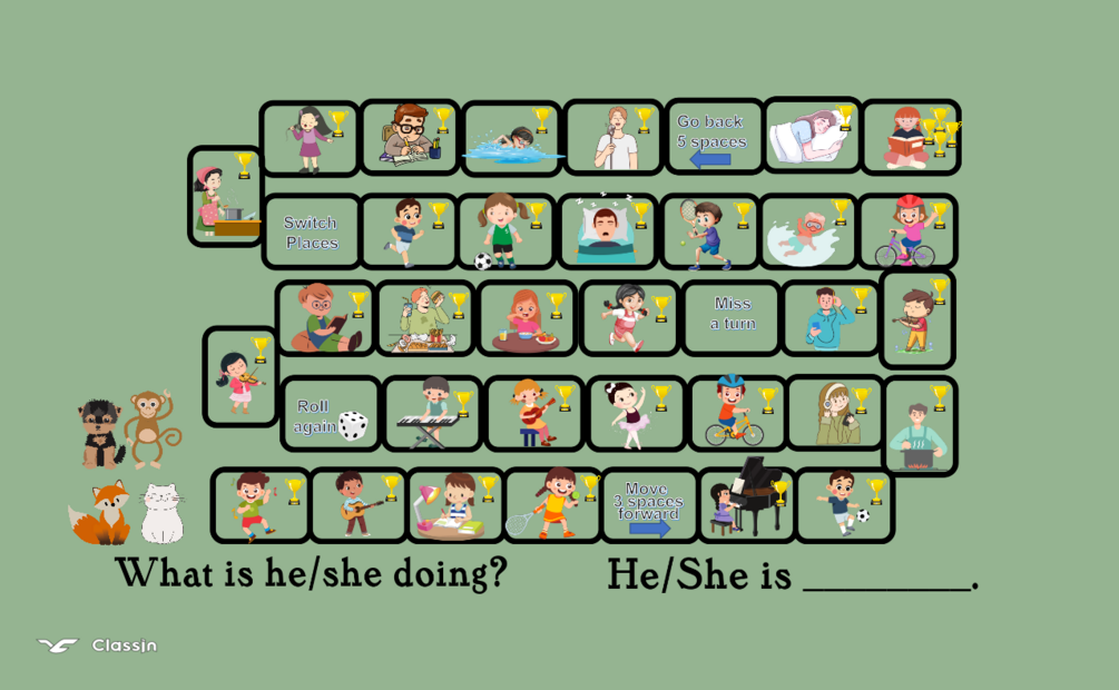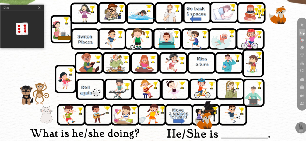 This is a board game that lets students practice asking and answering the question: "What is he/she doing?" Also, students will learn when to use he or she in sentences. They will also learn different verbs.