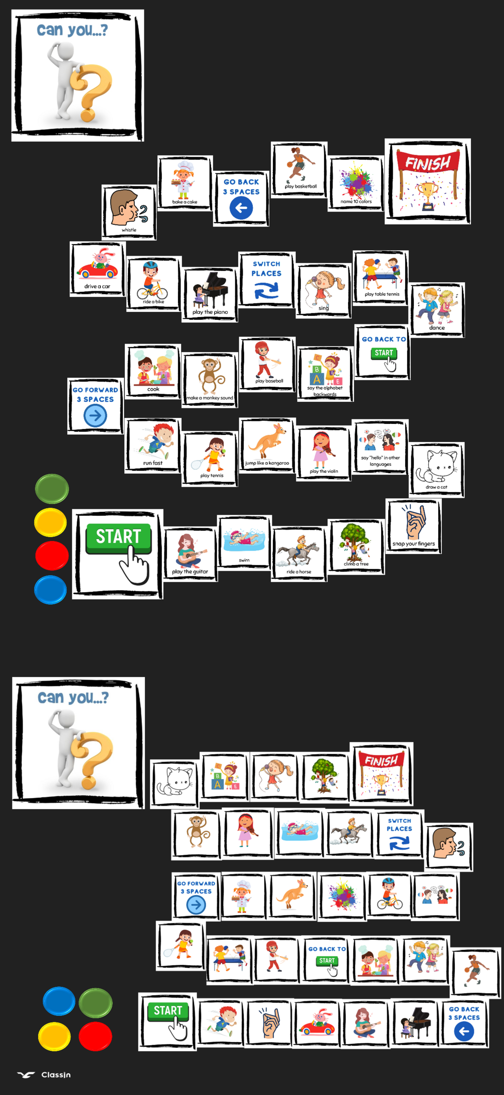 In this file, you will find two board games designed to improve students' language skills. The first game focuses on enhancing vocabulary and sentence construction through the use of "Can you" questions. The second game takes it a step further by removing the labels from each picture, challenging students to recall the vocabulary words they learned in the first game.
