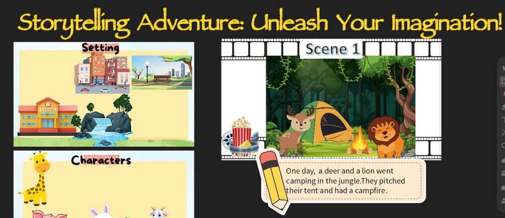 There are six storyboards in this activity. The settings and characters are given and students should use their creativity to weave a story using the given elements. Also, there are objects provided that can be used to add details to the story.